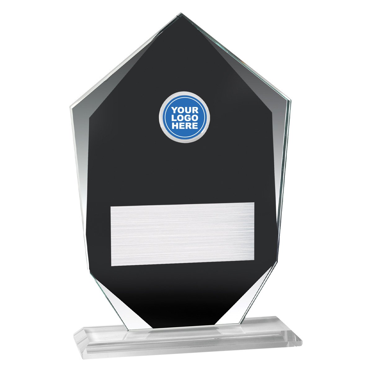 Bold glass awards feature distinct black colour with silver reflective border. Arrow shape presents a unique design for your budget glass awards. Space for your logo.