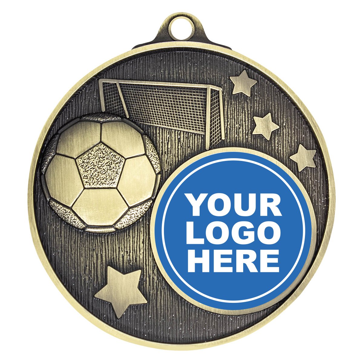Club Medals designed to specifically show off your custom logo insert. Medal design features iconic elements for football with theme of boot, ball & goals. Ideal for various events and competitions – available in gold and silver.