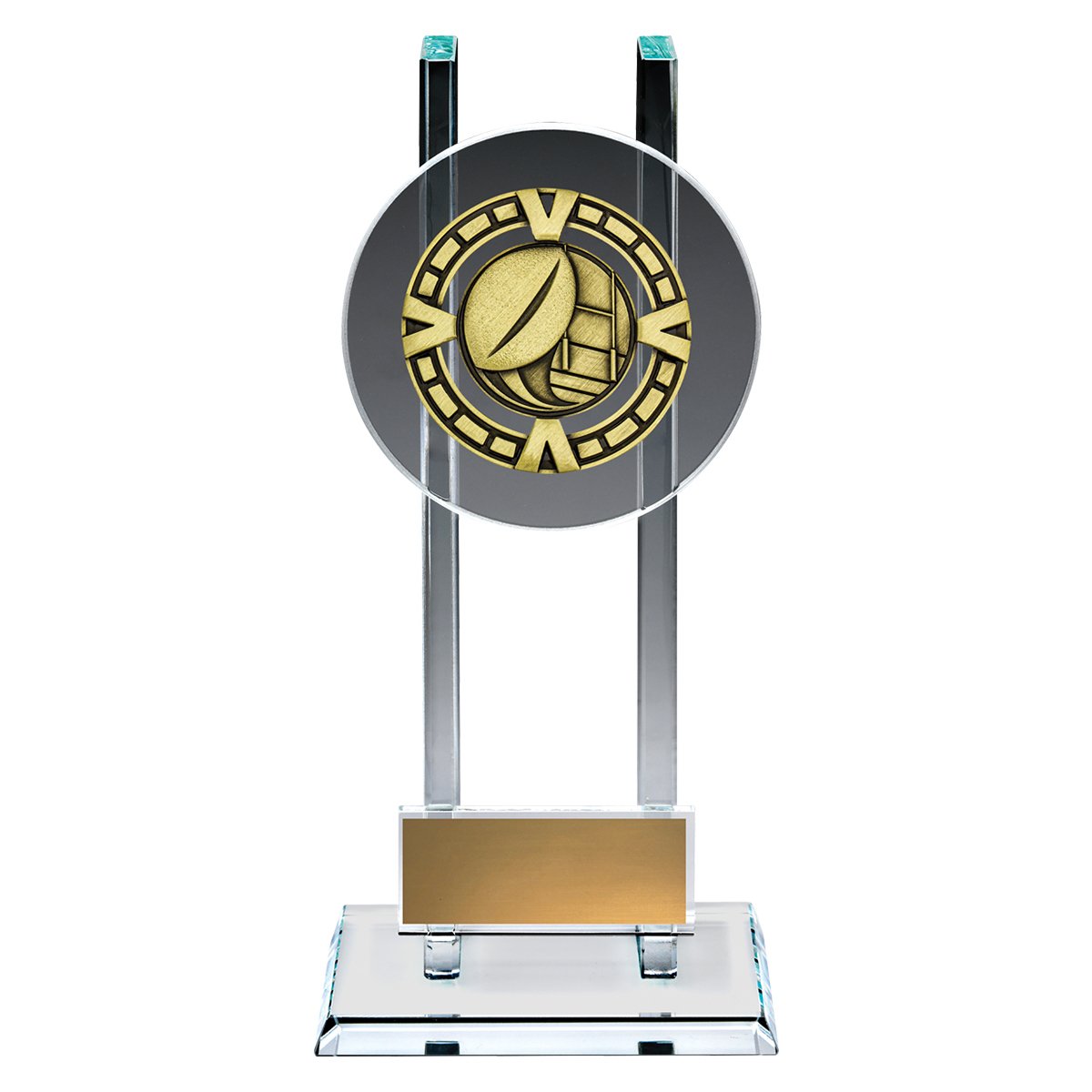 Bold glass awards are perfectly suited to recognise the top achievements at your team or club. Elevated glass platform showcases a brilliant metal theme for your sport or activity – space for your engraving as well.