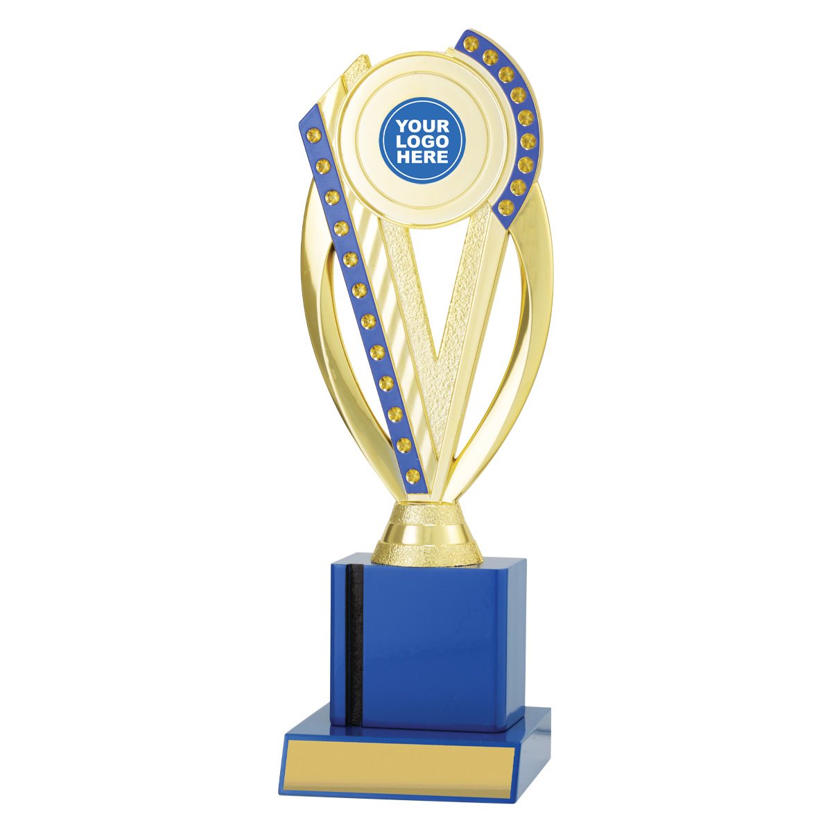 Series of blue column trophies that feature blue & gold trophy holder to showcase your custom logo or theme insert from the range available.