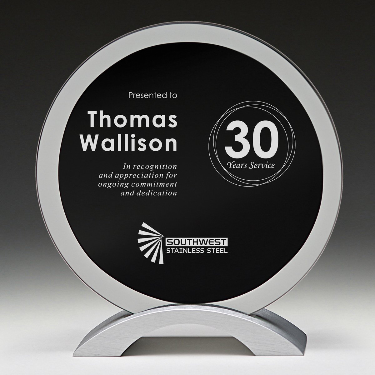 The sophisticated Luminary glass & metal award features an inner circle of black panel for your engraving within the larger design of clear glass.
