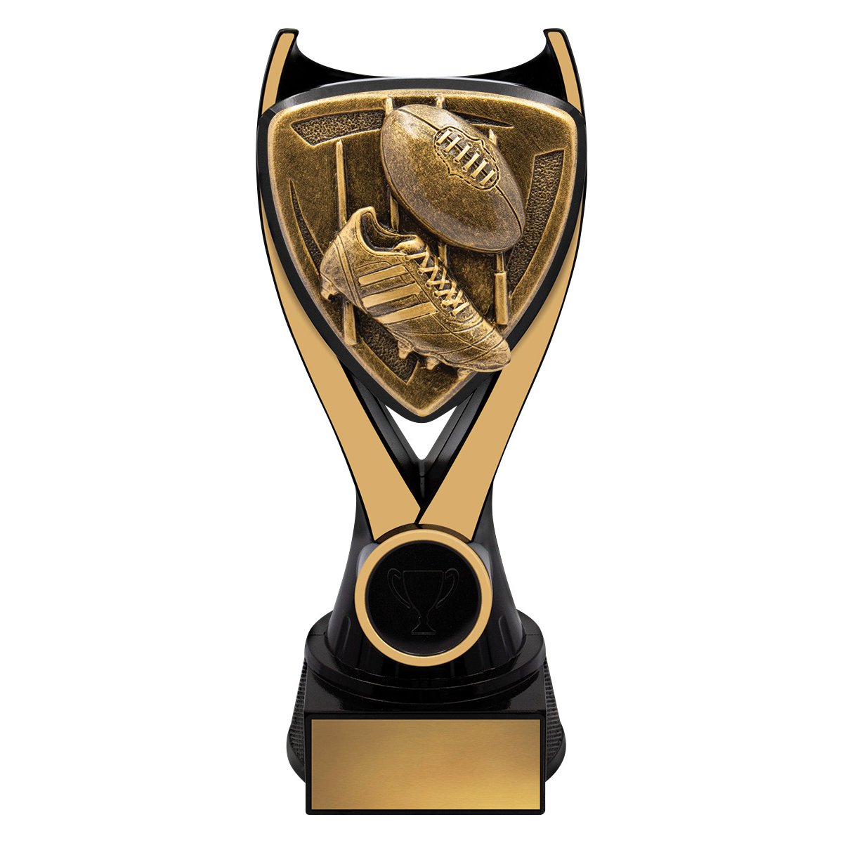 Nova series of trophies present a unique black & gold colour combination with a bold 3D type design to really celebrate the sport or activity of your awards.