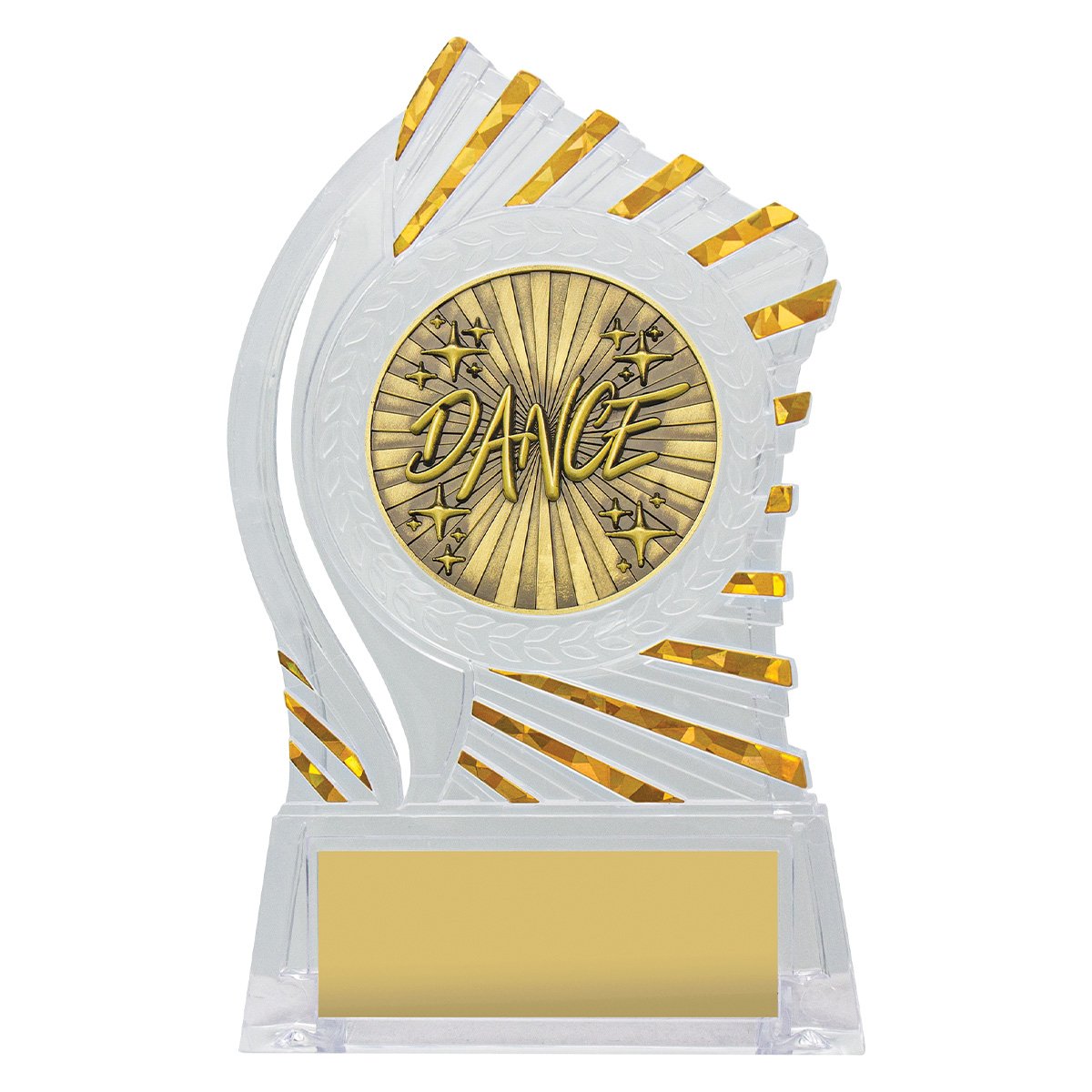Exciting design of acrylic trophy showcases the gold theme for your sport or trophy. An affordable award with terrific space for your engraving.