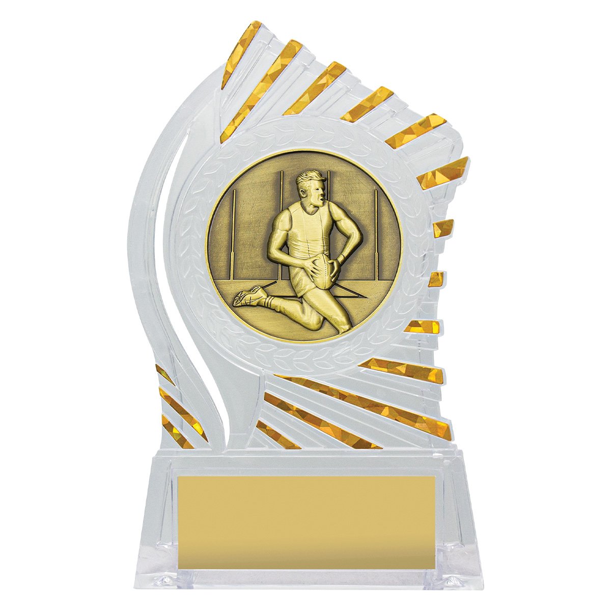 Exciting design of acrylic trophy showcases the gold theme for your sport or trophy. An affordable award with terrific space for your engraving.