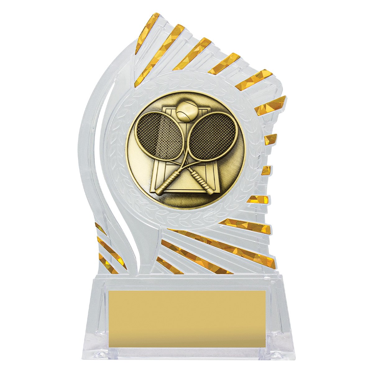 Exciting design of acrylic trophy showcases the gold theme for your sport or trophy. An affordable award with terrific space for your engraving.