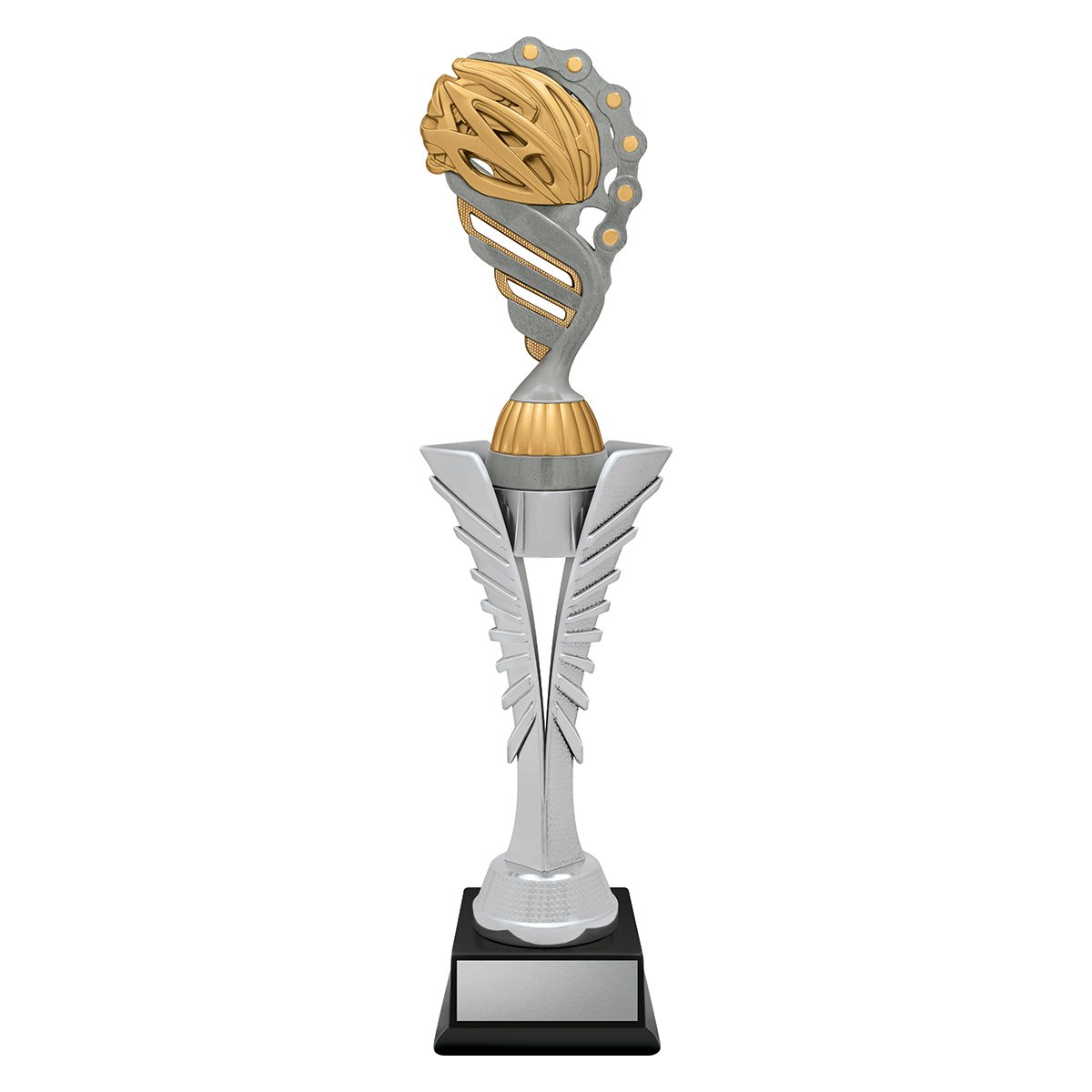 Silver Spear trophies showcase a brilliant top on a distinctive “spear” riser – the top finished in antique silver. Available in 3 sizes.